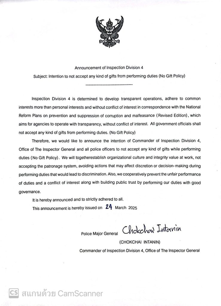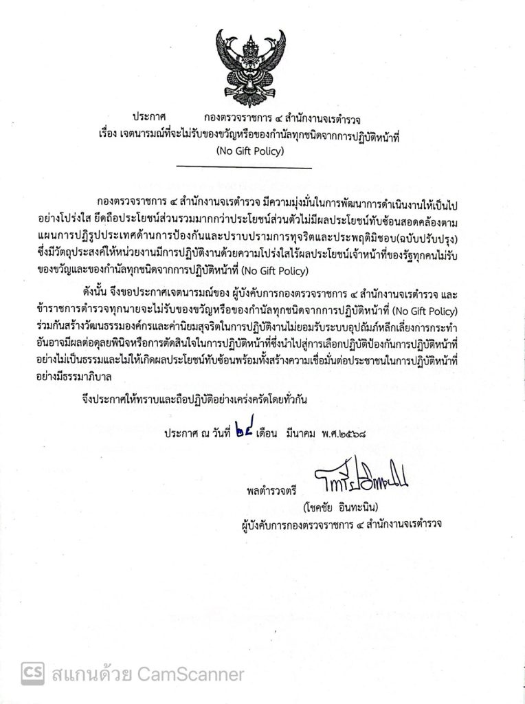 ตามหนังสือ สยศ.ตร. ด่วนที่สุด ที่ 0007.12/1555 ลง 20 มี.ค.68 ให้แจ้งหน่วยงานในสังกัด ตร. จัดทำประกาศ เรื่อง เจตนารมณ์ ที่จะไม่รับของขวัยหรือของกำนัลทุกชนิดจากการปฏิบัติหน้าที่ (No Gift Policy)